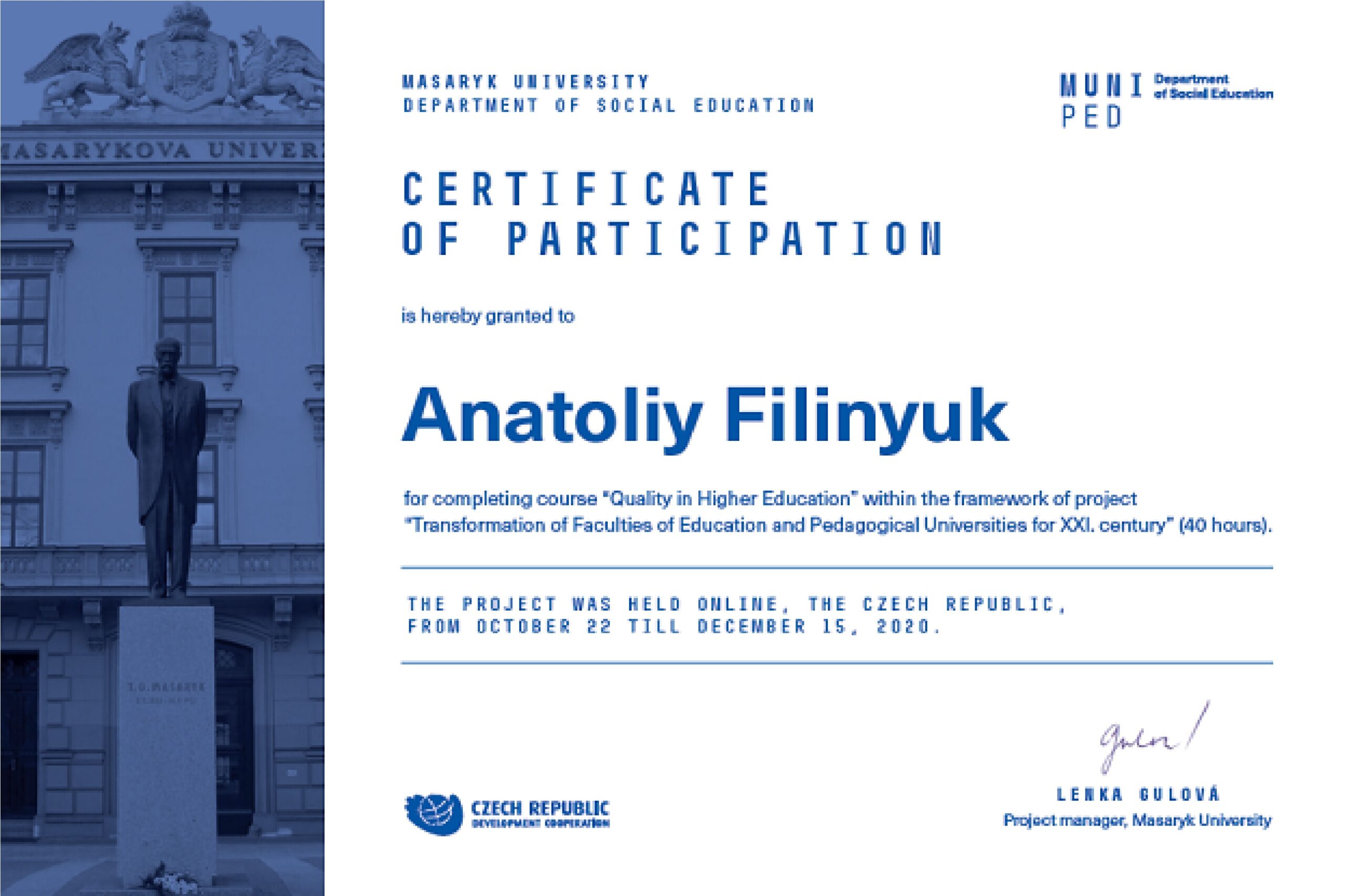 Карантинні обмеження та переведення значної частини професійної діяльності в онлайн-формат для викладачів нашої кафедри стали нагодою спробувати свої сили у нових сферах діяльності та набути нових знань. Завідувач кафедри історії України, доктор історичних наук, професор Анатолій Григорович ФІЛІНЮК упродовж жовтня-грудня 2020 р. взяв участь у проекті “Transformation on faculties od Education and Pedagogical Universities for XXI century”, успішно пройшовши курс “Quality in Higher Education”.