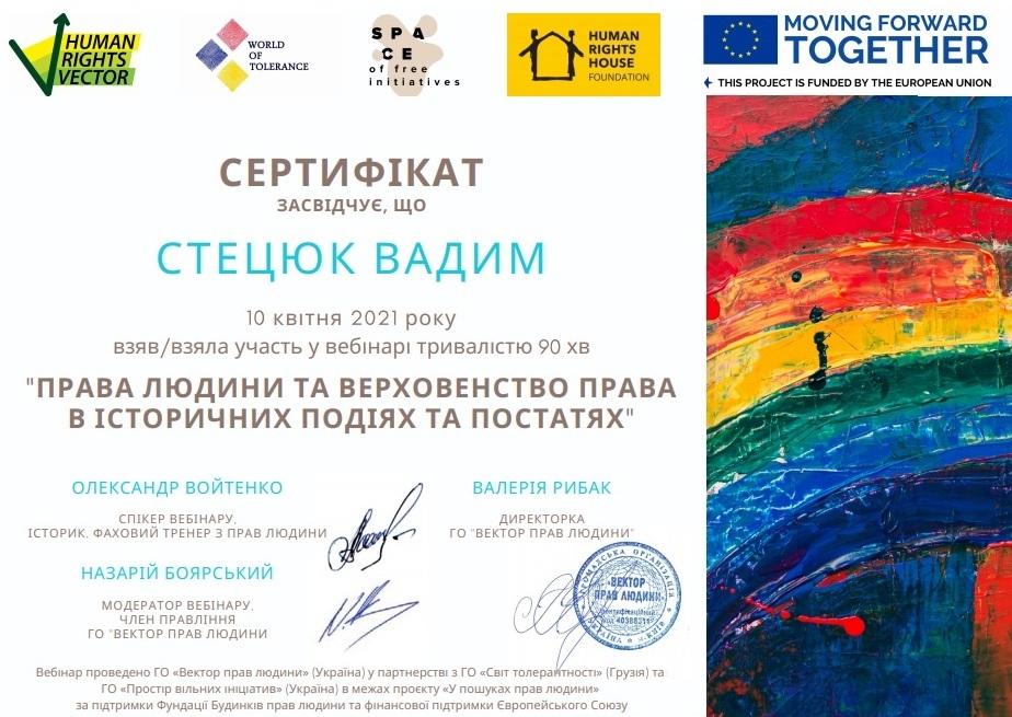 Так, 10 квітня доцент нашої кафедри Вадим Борисович Стецюк взяв участь у вебінарі “Права людини та верховенство права в історичних подіях та постатях”, спікером якого виступив історик, фаховий тренер з прав людини Олександр Войтенко.