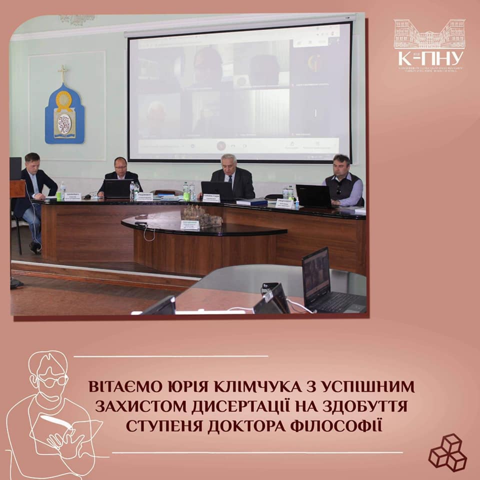 14 травня 2021 року в конференцзалі на засіданні разової спеціалізованої вченої ради ДФ 71.053.002 Кам′янець-Подільського національного університету імені Івана Огієнка відбувся захист дисертації на тему «Українці в антинацистському Русі Опору Франції та Італії в роки Другої світової війни» Юрія Клімчука, випускника нашої аспірантури, на здобуття ступеня доктора філософії в галузі знань 03 Гуманітарні науки за спеціальністю 032 Історія та археологія. Науковий керівник – академік НАНВО України, заслужений діяч науки і техніки України, доктор історичних наук, професор, Анатолій Філінюк. Голова ради – академік НАНВО України, академік Академії педагогічних і соціальних наук, академік Міжнародної кадрової академії, заслужений працівник освіти України, доктор історичних наук, професор Олександр Завальнюк. Рецензентами роботи виступили – академік НАНВО України, заступник декана з наукової роботи та інформатизації навчального процесу, доктор історичних наук, професор кафедри історії України Олександр Комарніцький, кандидат історичних наук, доцент кафедри всесвітньої історії Іван Боровець.