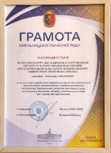 28 травня 2024 р. грамотою Хмельницької обласної ради нагороджено колектив Центру дослідження історії Поділля Інституту історії України НАН України при Кам’янець-Подільському національному університеті імені Івана Огієнка (керівник – доктор історичних наук, професор Олександр ЗАВАЛЬНЮК). Науковий осередок відзначено за заслуги перед українською історичною наукою та національним краєзнавством, вагомий внесок в історико-регіональні дослідження Хмельниччини, розбудову краєзнавчого руху, волонтерську діяльність, активну громадянську позицію та з нагоди Всеукраїнського дня краєзнавства.